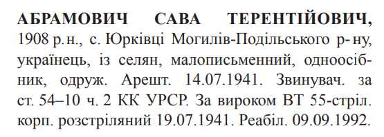 Соціальне походження: одноосібникОсвіта: малописьменнийСімейний стан: одруженийЗаарештований: 14.07.1941Звинувачення: ст. 54-10 ч.2 КК УССРВТ 55-стрілецького корпусу засуджений до розстрілуДата вироку: 18.07.1941Сава Абрамович розстріляний 19.07.1941Реабілітований: Генеральною прокуратурою України 09.09.1992