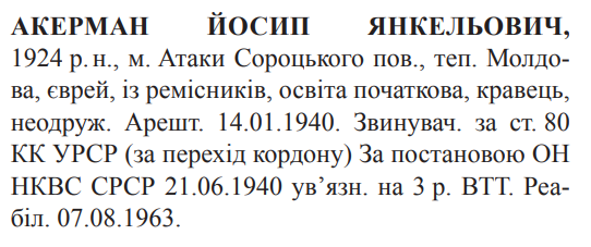 Соціальне походження: н/дОсвіта: 4 кл.Професія (місце роботи): кравецьСімейний стан: неодруженийЗаарештований: 14.01.1940Звинувачення: ст. 80 КК УССРОН НКВД СССР засуджений до 3 років ВТТДата вироку: 21.06.1940Реабілітований: Вінницьким облсудом 07.08.1963 р.