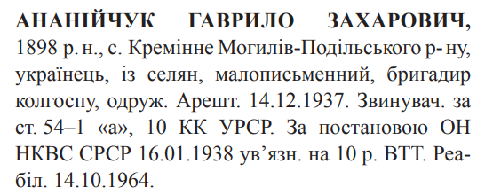 Реабілітований: Вінницьким облсудом 14.10.1964 Реабілітовані історією