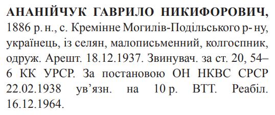 Реабілітований: Вінницьким облсудом 16.12.1964 Реабілітовані історією