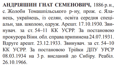 Участник збройного опору російському большевизму 1918-20 рр. Потрапив до полону. На особливому обліку ЧК-ГПУ з 1922 р.Заарештований: 17.10.1930Звинувачення: ст. 54-11 КК УССРПрокурором Вінницької області звільнений і реабілітованийДата вироку: 24.07.1931Заарештований: 23.12.1933Звинувачення: ст. 54-10 КК УССРТрійкою ДПУ засуджений до 3 років засланняДата вироку: 08.03.1934Реабілітований: Вінницьким облсудом 26.10.1966