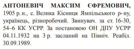 16, 30, 54-6 КК УССР. ОН при колегії ГПУ УССР засуджений до 3 років заслання