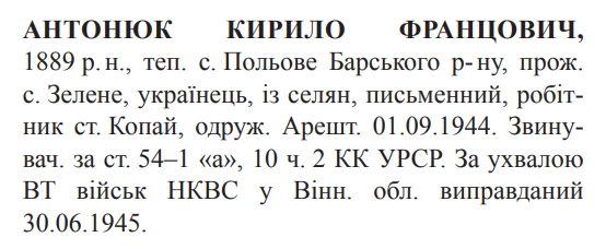 54-1 "а", 54-10 ч.2 КК УССР. Трибуналом військ НКВС Вінницької обл. виправданий