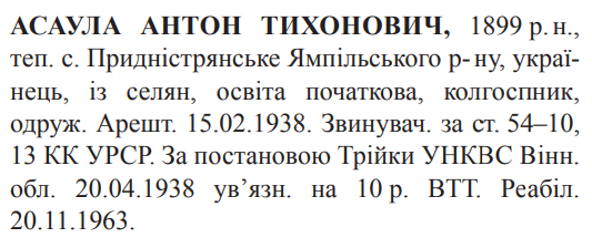 54-10, 54-13 КК УССР. Трійкою УНКВС Вінницької обл. засуджений до 10 років ВТТ