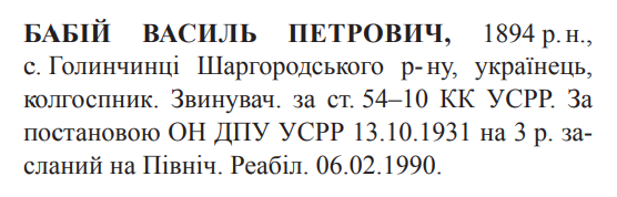 Реабілітований: Вінницькою облпрокуратурою 06.02.1990 Реабілітовані історією