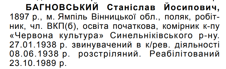 Станіслав Багновський розстріляний 08.06.1938 р.
