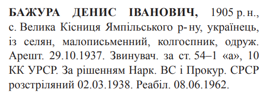 Соціальне походження: із селянОсвіта: малограмотнийПрофесія (місце роботи): колгоспникСімейний стан: одруженийЗаарештований: 29.10.1937Звинувачення: ст. 54-1 "а", 54-10 КК УССРНаркомом ВС і Прокурором СССР засуджений до розстрілуДата вироку: 03.02.1938Денис Бажура розстріляний в м. Вінниця 03.03.1938 р.Реабілітований: ВТ Прикарпатського ВО 08.06.1962 р.