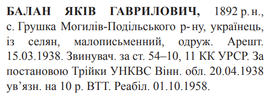 54-10, 54-11 КК УССР. Трійкою УНКВС Вінницької обл. засуджений до 10 років ВТТ
