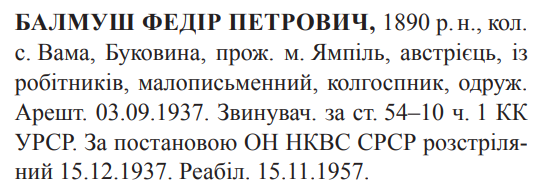 Соціальне походження: з робітниківОсвіта: малограмотнийПрофесія (місце роботи): колгоспникСімейний стан: одружений, 3 дітейЗаарештований: 03.09.1937Звинувачення: ст. 54-10 ч.1 КК УССРОН НКВД СССР засуджений до розстрілуДата вироку: 01.12.1937Федір Балмуш розстріляний 15.12.1937 р. в м. Могилів-ПодільськийРеабілітований: Верховним судом УССР 15.11.1957