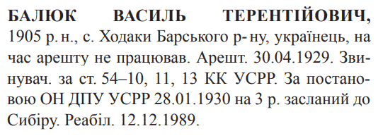 54-10, 54-11, 54-13 КК УССР. ОН при колегії ГПУ УССР засуджений до 3 років заслання