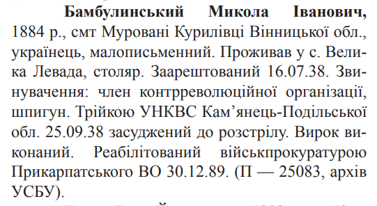 Соціальне походження: н/дОсвіта: малописьменнийПрофесія (місце роботи): столярЗаарештований: 16.07.1938Звинувачення: "член контрреволюційної організації, шпигун"Трійкою УНКВД Кам'янець-Подільської обл. засуджений до розстрілуДата вироку: 25.09.1938 Дата виконання вироку: н/дРеабілітований: Військовою прокуратурою Прикарпатського ВО 30.12.1989 р.