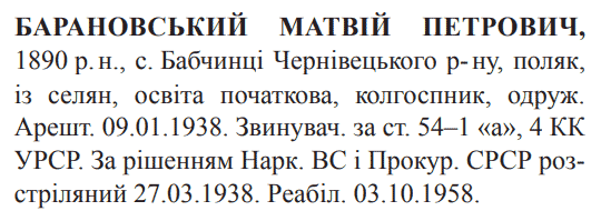 Соціальне походження: із селянОсвіта: початковаПрофесія (місце роботи): колгоспникСімейний стан: одружений, 2 дітейЗаарештований: 09.01.1938Звинувачення: ст. 54-1 "а" 54-4 КК УССРНаркомом ВС і Прокурором СССР засуджений до розстрілуДата вироку: 09.02.1938Матвій Барановський розстріляний 28.03.1938 р. в м. ВінницяРеабілітований: Верховним судом УССР 03.10.1958