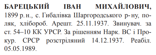 Соціальне походження: н/дОсвіта: н/дПрофесія (місце роботи): хліборобЗаарештований: 25.11.1937Звинувачення: ст. 54-10 КК УССРНаркомом ВС і Прокурором СССР засуджений до розстрілуДата вироку: 09.12.1937Іван Барецький розстріляний в м. Вінниця 15.12.1937 р. в м. Вінниця.Реабілітований: Вінницьким облпрокурором 05.05.1989