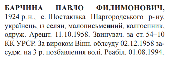 54-10 КК УССР. Вінницьким облсудом засуджений до 3 років ВТТ з пораженням у правах на 2 роки