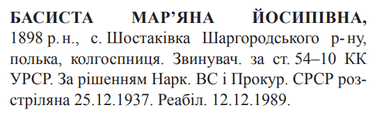 Мар'яна Басиста розстріляна в м. Вінниця 26.12.1937 р.