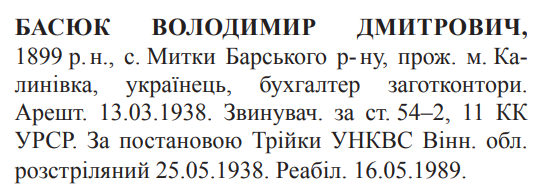 Реабілітований: Вінницькою прокуратурою 16.05.1989 Реабілітовані історією