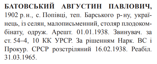 Соціальне походження: із селянОсвіта: малописьменнийПрофесія (місце роботи): столяр плодокомбінатуСімейний стан: одружений, 1 донькаЗаарештований: 01.01.1938Звинувачення: ст. 54-4, 54-10 КК УССРНаркомом ВС і Прокурором СССР засуджений до розстрілуДата вироку: 03.02.1938Августин Батовський розстріляний у Вінниці 17.02.1938 р.Реабілітований: Верховним судом УССР 31.03.1965