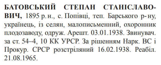Степан Батовський розстріляний в м. Вінниця 17.02.1938