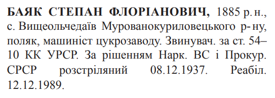 Степан Баяк розстріляний в м. Вінниця 08.12.1937 р.