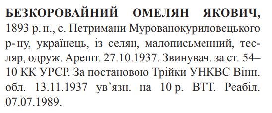 Реабілітований: Вінницьким облпрокурором 07.07.1989 Реабілітовані історією