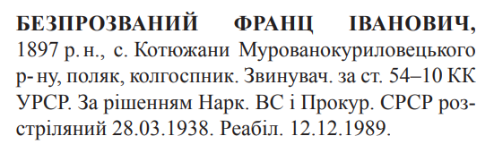 Соціальне походження: н/дОсвіта: н/дПрофесія (місце роботи): колгоспникЗаарештований: н/дЗвинувачення: ст. 54-10 КК УССРНаркомом ВС і Прокурором СССР засуджений до розстрілуДата вироку: 08.02.1938Франц Безпрозваний розстріляний 28.03.1938 р. в м. ВінницяРеабілітований: Вінницькою облпрокуратурою 12.12.1989