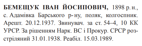 Реабілітований: Вінницькою облпрокуратурою 15.03.1989 Реабілітовані історією