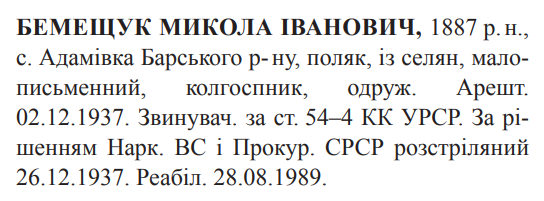 Реабілітований: Вінницьким облпрокурором 28.08.1989 Реабілітовані історією