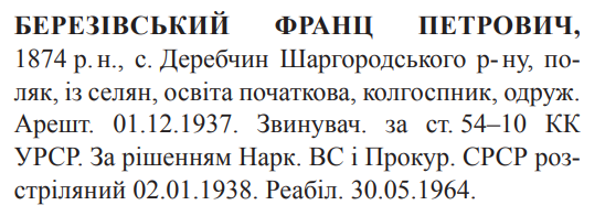 Соціальне походження: із селянОсвіта: початковаПрофесія (місце роботи): колгоспникСімейний стан: одружений, 1 синЗаарештований: 01.12.1937Звинувачення: ст. 54-10 КК УССРНаркомом ВС і Прокурором СССР засуджений до розстрілуДата вироку: 26.12.1937 (протокол № 625)Франц Березовський розстріляний в м. Вінниця 03.01.1938 р.Реабілітований: Верховним судом УССР 30.05.1964(Можливі варіанти написання прізвища кирилицею: Брозовський, Бжозовський)