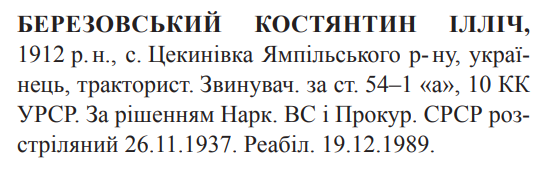 Костянтин Ілліч Березовський розстріляний 26.11.1937