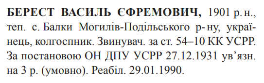 Реабілітований: Вінницькою облпрокуратурою 29.01.1990 Реабілітовані історією