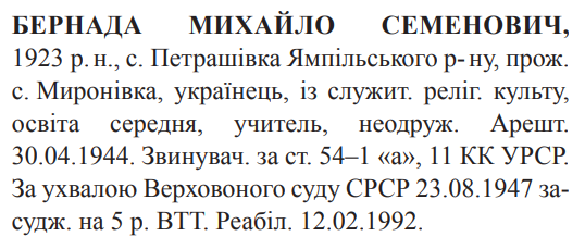 54-1 "а", 54-11 КК УССР. Трибуналом військ НКВС Вінницької обл. засуджений до 20 років ВТТ