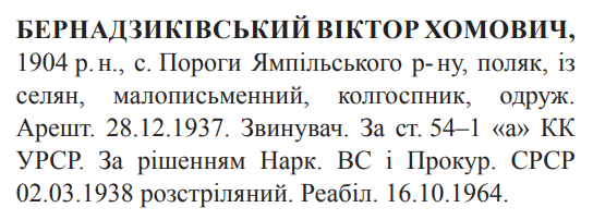 Соціальне походження: н/дОсвіта: початковаПрофесія (місце роботи): колгоспникСімейний стан: одружений, 2 синівЗаарештований: 28.12.1937Звинувачення: ст. 54-1 "а" КК УССРНаркомом ВС і Прокурором СССР засуджений до розстрілуДата вироку: 31.01.1938 (Протокол №126)Віктор Бернадзиковський розстріляний 03.03.1938 р. у ВінниціРеабілітований: Верховним судом УССР 16.10.1964