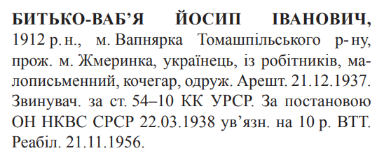 Реабілітований: Вінницьким облсудом 21.11.1956 р. Реабілітовані історією