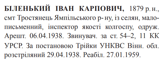 Іван Біленький розстріляний 29.04.1938