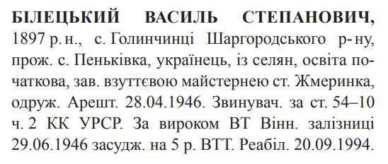 Реабілітований: Вінницьким облпрокурором 20.09.1994 Реабілітовані історією