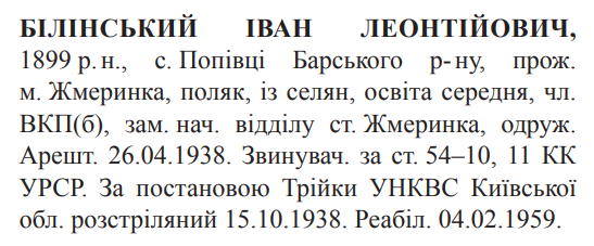Іван Білінський розстріляний 15.10.1938 р. у Києві.