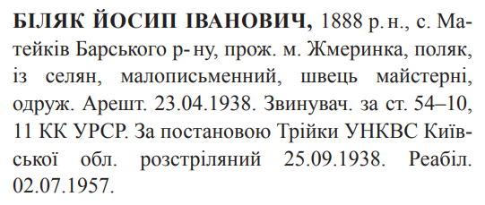 Йосип Біляк розстріляний 25.09.1938 р. у Києві.