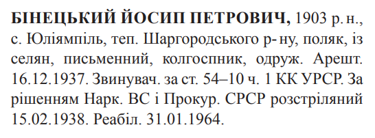 Йосип Бінецький розстріляний 15.02.1938