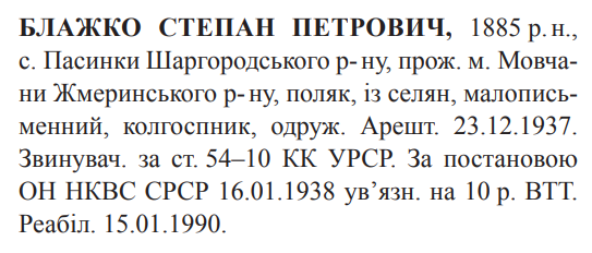 Реабілітований: Вінницьким облпрокурором 15.01.1990 Реабілітовані історією
