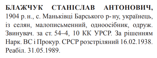 Соціальне походження: із селянОсвіта: малограмотнийПрофесія (місце роботи): одноосібникСімейний стан: одружений, 2 дітейЗаарештований: н/дЗвинувачення: ст. 54-4, 54-10 КК УССРНаркомом ВС і Прокурором СССР засуджений до розстрілуДата вироку: 03.02.1938Станіслав Блащук розстріляний у Вінниці 17.02.1938 р.Реабілітований: Вінницьким облпрокурором 31.05.1989