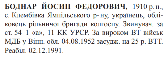 54-1 "а", 54-11 КК УССР. Трибуналом військ МГБ Вінницької обл. засуджений до 25 років ВТТ