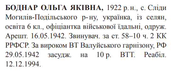 Реабілітована: Вінницькою облпрокуратурою 12.12.1994 Реабілітовані історією