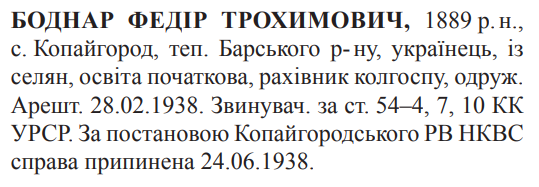 Реабілітований: Копайгородським районним відділом НКВС 24.06.1938