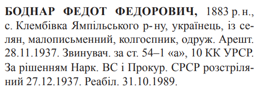 Федот Боднар розстріляний 27.12.1937