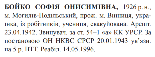Реабілітована: Вінницькою облпрокуратурою 14.05.1996 Реабілітовані історією