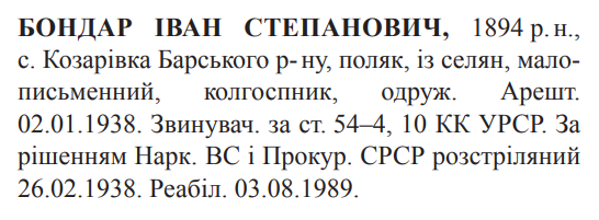 Соціальне походження: із селянОсвіта: малограмотнийПрофесія (місце роботи): колгоспникСімейний стан: одружений, 4 дітейЗаарештований: 02.01.1938Звинувачення: ст. 54-4, 54-10 КК УССРНаркомом ВС і Прокурором СССР засуджений до розстрілуДата вироку: 08.02.1938Іван Бондар розстрілянийу Вінниці 27.02.1938 р.Реабілітований: Вінницьким облпрокурором 03.08.1989