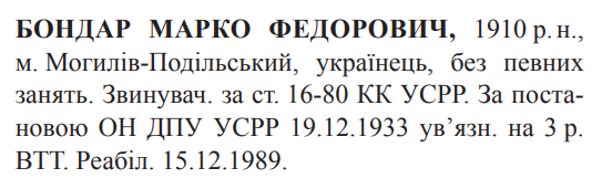 16, 80 КК УССР. ОН при колегії ГПУ УССР засуджений до 3 років ВТТ