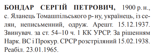 Соціальне походження: із селянОсвіта: неграмотнийСімейний стан: одружений, 4 дітейЗаарештований: 15.12.1937Звинувачення: ст. 54-10 ч.1 КК УССРНаркомом ВС і Прокурором СССР засуджений до розстрілуДата вироку: 16.01.1938 (протокол № 797)Сергій Бондар розстріляний 16.02.1938 р. в м. Вінниця.Реабілітований: Верховним судом УССР 23.01.1965(Можливий варіант написання прізвища: Боднар)