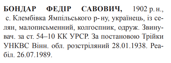 Реабілітований: Вінницьким облпрокурором 26.07.1989 Реабілітовані історією