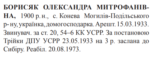 20, 54-6 КК УССР. Трійкою ГПУ УССР засуджена до 3 років заслання